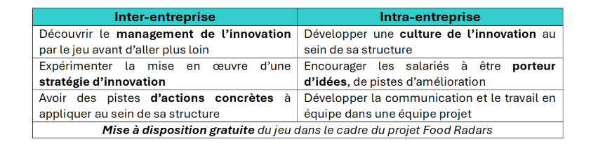 Ce « jeu sérieux » a été particulièrement travaillé pour permettre le parallèle avec la réalité de la vie d’une entreprise et avec les incertitudes inhérentes à l’innovation. Il donne accès à différents degrés de lecture permettant à tous les participants d’acquérir des connaissances quelle que soit leur expertise initiale.